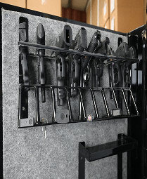 For ammunition storage, we offer a wall or door mounted racks to securely store boxed cartridges. The racks are made with 10-gauge steel and are painted to match your safe.